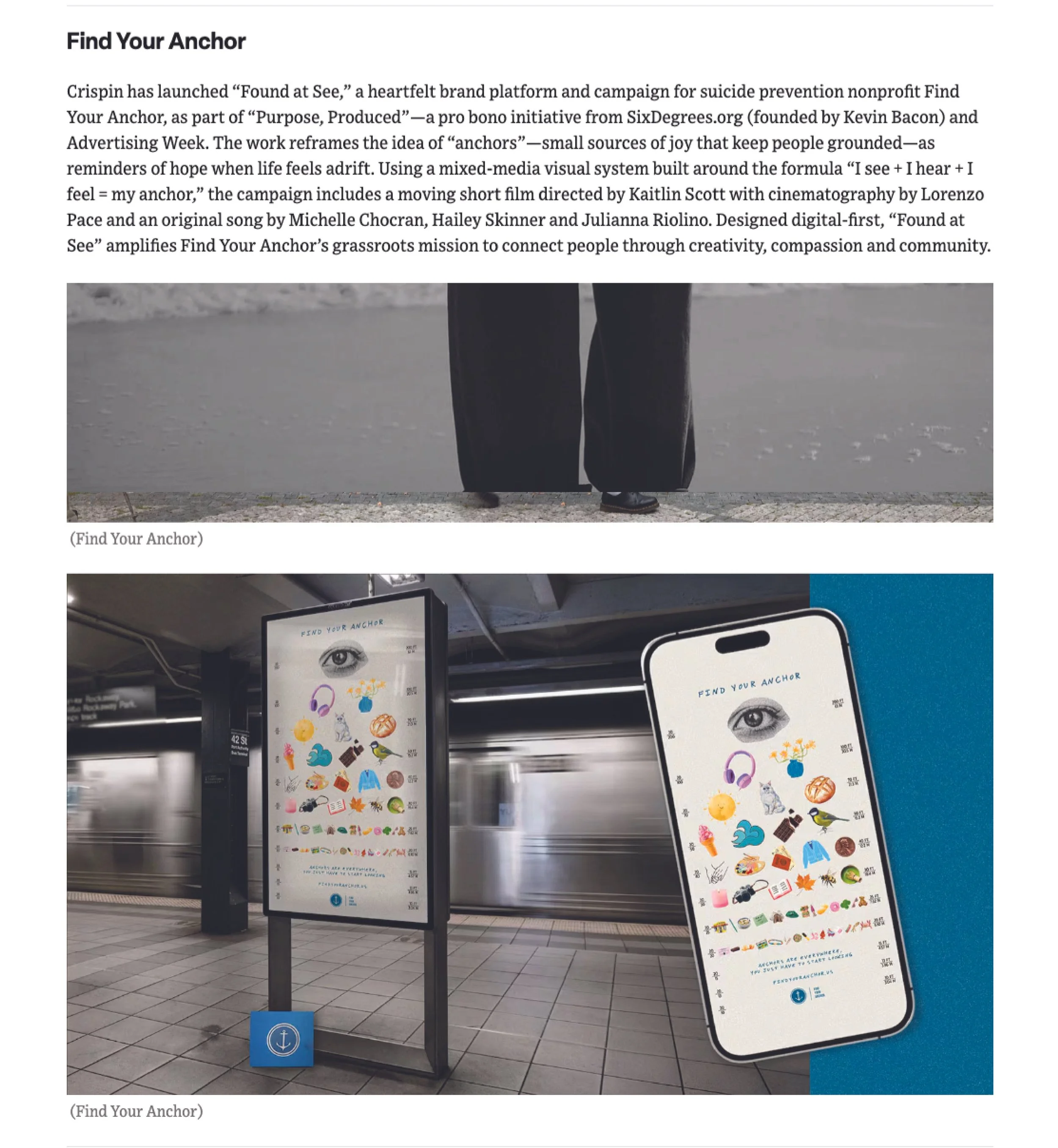 We partnered with Six Degrees of Kevin Bacon and Advertising eek for a larger initiative, “Purposed Produced.” Our job was to elevate Find Your Anchor’s mission, that each person needs an anchor, or little things in life that bring joy, and drive awareness to the idea of 'anchors' to people in the struggle of depression and suicidal thoughts.